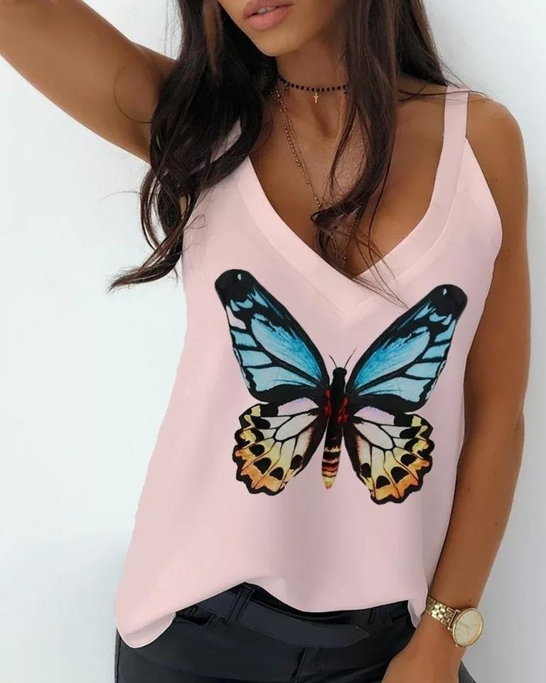 Kadın Kelebek Baskılı Sandy Kumaş Askılı Bluz