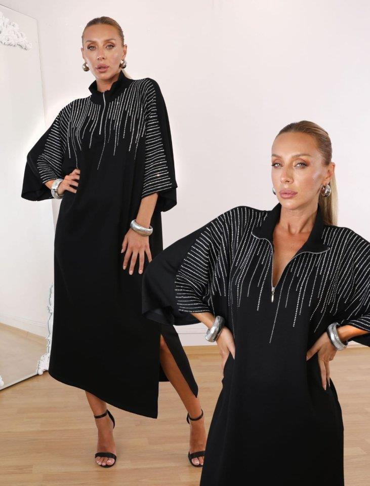 Kadın Hakim Yaka Fakir Kol Taş Detay Maxi Boy Salaş Elbise