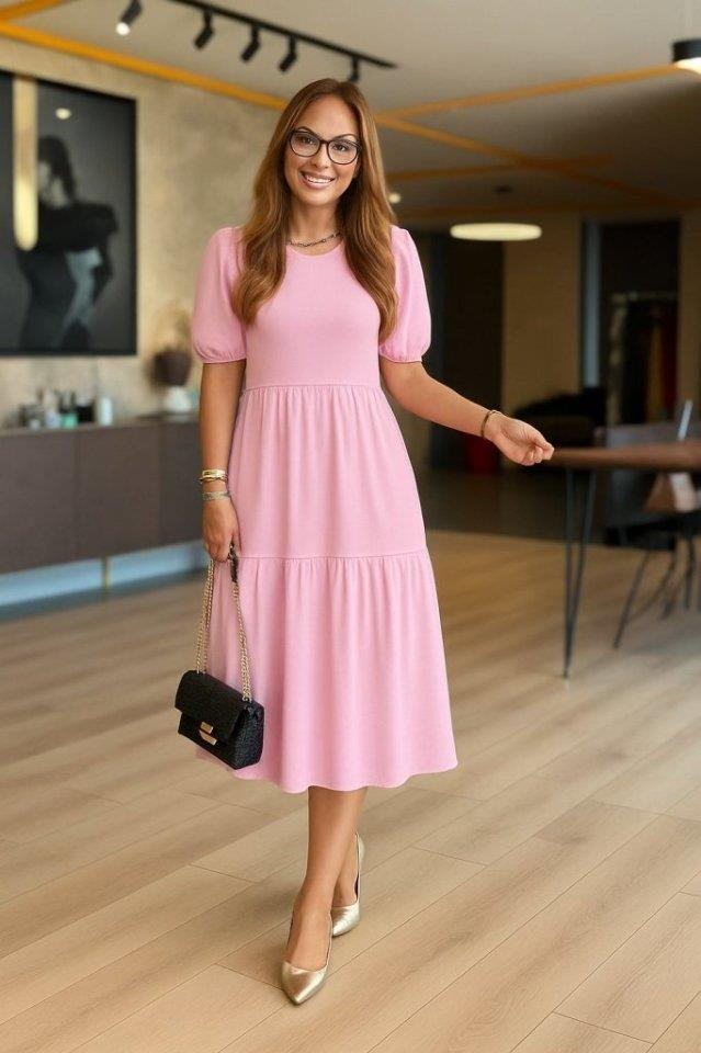 Kadın Kısa Kollu Yakası Açık Katlı Bürümcük Balon Elbise