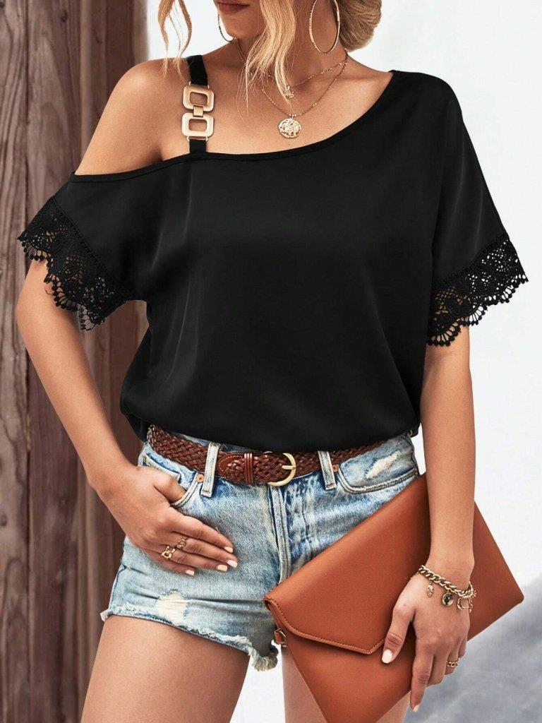 Kadın Tek Omuzu Askılı Kısa Kollu Toka Detaylı Dantelli Viskon Bluz
