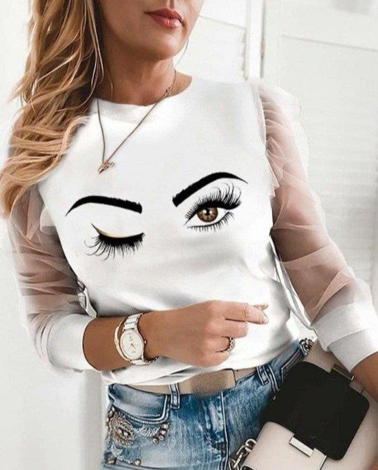 Kadın Uzun Kollu Bisiklet Yaka Göz Baskılı Kolları Tül Detay Dalgıç Bluz